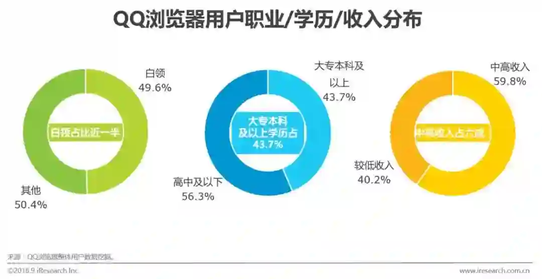 从职业性质看, 49.6%的QQ浏览器用户是白领阶层;从学历水平来看,QQ浏览器用户大专/本科及以上学历比例多,占比43.7%;在收入方面,59.8%用户收入处于中高水平。综合来看,QQ浏览器凭借其视频、资讯等丰富的内容和多样化的功能版块,吸引了以居住在二三线城市为主、生活相对稳定宽松的高素质人群;QQ浏览器亦成为用户在追求物质与精神生活质量时有效的信息资源和渠道之一。