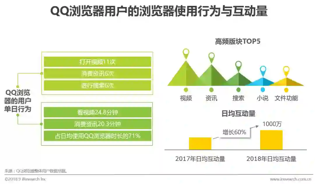 根据大数据挖掘结果显示,用户使用QQ浏览器功能TOP5是视频、资讯、搜索、小说、文件功能,每天打开视频11次,看视频24.8分钟,浏览消费资讯6次,平均时间20.3分钟。另外,2018年用户在使用QQ浏览器时日均互动量接近1000万,较去年提升60%。QQ浏览器用户喜欢文娱生活,喜欢消费资讯,并在在浏览器中形成了积极的互动习惯。