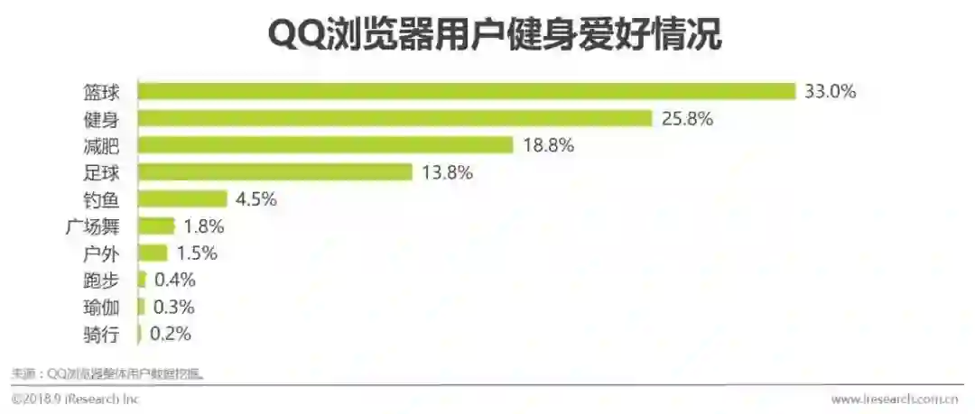 大数据挖掘结果显示,QQ浏览器用户注重健身,篮球运动最受欢迎,占比33.0%,其次是健身和减肥运动,分别占比25.8%和18.8%。随着移动健身的风靡与兴起,运动社区类APP成为用户最为常用的工具,在运动的同时进行体育社交开始成为用户的健身习惯和生活方式之一。