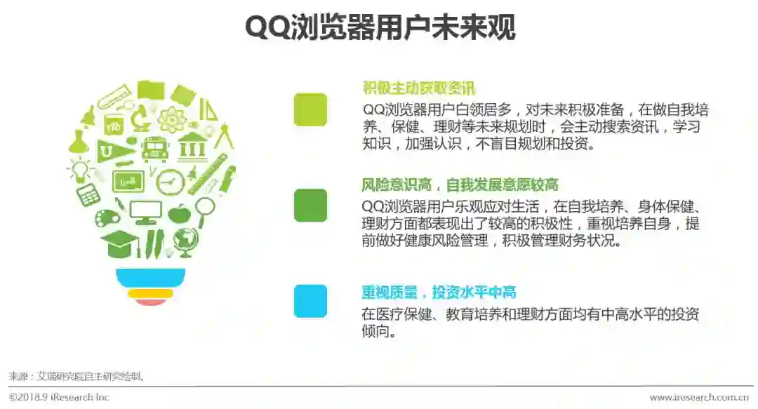综合QQ浏览器用户教育、医疗保健、理财等行为态度和关注偏好多方面数据来看,他们对未来生活持积极投资的态度,对自身培养、健康管理、理财有风险意识,为未来提前在各个方面理性而实际的做出计划,未雨绸缪。