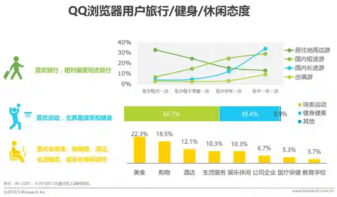 根据大数据挖掘结果显示,在物质财富拥有的同时,QQ浏览器用户也十分重视生活中的体验感。他们喜欢旅行,相对偏爱短途旅行;喜欢运动,其中球类运动和健身健美是他们偏爱的运动方式;同时,消费和休闲服务带来的幸福感是生活中的重要组成部分,美食饭店、购物圈、酒店、生活服务点、娱乐休闲场所是他们平时喜欢光顾的场所。