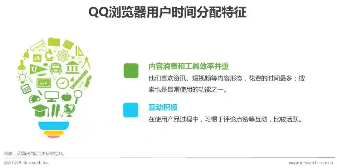 综合大数据挖掘结果来看,QQ浏览器用户在资讯方面内容与效率并重,对资讯、视频/短视频内容花费时间最多,对提升效率的文件功能也有很高需求。在使用浏览器时,转发、评论、赞等互动行为较多,活跃性高,粘性较高。