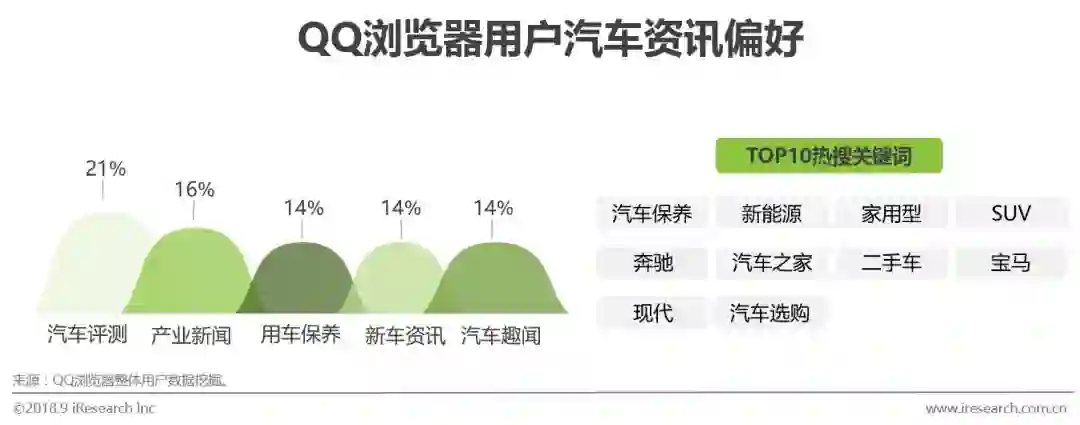 从用户的购买决策调研结果显示,QQ浏览器用户在购买汽车时,首先考虑性能/安全性/外观,之后才是价格。在汽车资讯方面,会广泛关注汽车评测和产业新闻,喜欢从实际的数据判断选购车辆的好坏。在搜索关键词方面,用户对汽车保养、新能源、家用型、SUV等较为关注,说明大多数用户较为务实,以家用需求为主。综合来看,QQ浏览器用户在汽车购买时习惯将实际的汽车评测数据、产业新闻作为依据,在实际考虑因素方面,汽车实际的性能/安全感是用户更优先考虑的。