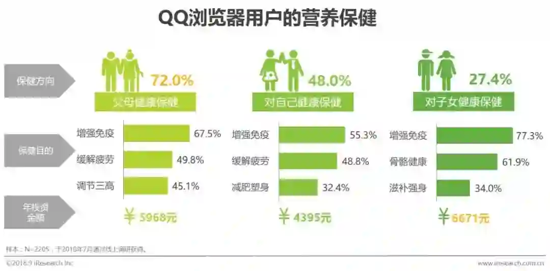 作为年轻一代的QQ浏览器用户,他们更加注意父母在营养保健方面的投资,主要面向父母,其次是自己,最后是孩子。对于父母,多以增强免疫、缓解疲劳,调节三高为主要保健目的;对于自己,用户希望通过营养保健能增强自身免疫,缓解疲劳,减肥塑身;对于孩子,增强儿童免疫,强壮骨骼和滋补强身是主要方向。从营养保健的年花销水平来看,用户在孩子营养保健上开支最多,均值达6671元,父母营养保健的开支其次,均值为5968元。