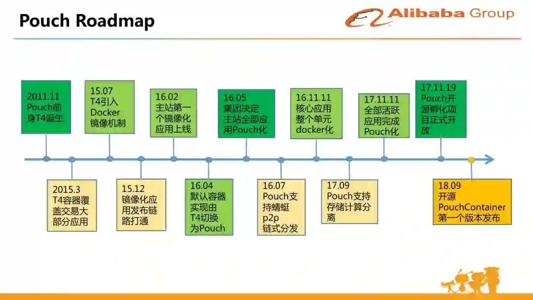 上面是 PouchContainer 容器的 Roadmap, 2011 年的时候 T4 上线 ,到 2015 年 3 月的 T4 覆盖了交易的大部分应用。这个时候开始引入了 Docker 镜像机制,这里面做了很多兼容性的工作。比如说原来 T4 轻量化的模板转化成对应的基础镜像,里面兼容了很多之前运维的习惯和运维的工具,如账号推送,安全策略,系统检测。