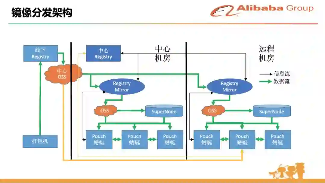 这是 PouchContainer 的镜像分发设计。我们内部有很多比较核心的应用,体量比较大,实例会分布在上万台物理机上。发布新版本的时候上万台机器同时拉镜像,任何中心的镜像仓库都扛不住。因此我们设计了一套镜像分发的二级架构,在每个地域建一个 mirror,在同一个地域内拉镜像的时候用 P2P 分发技术 --- 我们内部的产品名叫蜻蜓,已经开源;需要拉镜像的服务器之间可以分散互相拉文件片段,这样就直接化解了中心镜像仓库的服务压力和网络压力。后面其实还有更好的解决镜像分发的思路,我们正在尝试镜像的远程化,通过存储计算分离技术,用远程盘的方式挂载镜像,直接跳过或者说异步化了镜像分发这一步,目前正在内部环境灰度运行中。