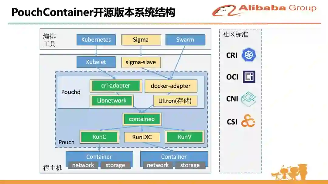 所以我们开源版本是重新开始搭建的,这样会比较清爽一些。我们引入了 contained,支持不同的 runtime 实现,包括我们自己包装 lxc 开发的 RunLXC 运行时,可以用来支持老版本 2.6.32 内核。开源版 PouchContainer 兼容所有 Docker 的接口,也支持 CRI 协议,这样也就同时支持了比较主流的两种集群管理系统。网络方面我们内部基于 libnetwork 做了增强,包括不同场景暴露出来的一些问题,一些稳定性,规模化的时候各种细节的一些优化。存储方面我们支持了多盘,内存盘,远程盘等各种不同形式的存储。PouchContainer 可以无缝集成到上层编排工具中,包括 Kubelet 和 Swarm 等。我们内部的 Sigma 调度系统,不同的版本 Docker 协议和 CRI 协议都会使用。