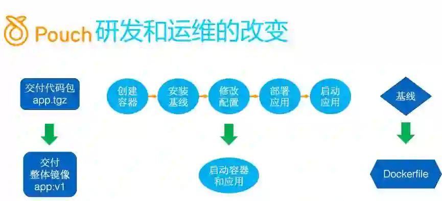 我们在 2016 年初上线了第一个镜像化应用,到 5 月份的时候集团决定主站全部应用容器化。在做镜像之前阿里是有一两百人的团队做每个应用的部署,运维,稳定性控制,后来这个团队都没有了,全部转成了 DevOps,转向开发工具和运维平台,通过代码的方式,工具的方式解决运维的问题。之前专职做运维的同学最大的负担就是线上环境的变更,研发提交变更申请给运维同学,运维同学做线上操作,研发不知道代码运行环境具体依赖了哪些基础软件。做了镜像化的事情后,研发自己负责编写 Dockerfile,运维就把环境变更的事情通过 Dockerfile 的机制移交给了研发。运维和研发之间的边界就非常清楚了,这个边界就是由 Dockerfile 来定义的。研发负责把他代码依赖的环境在 Dockerfile 定义好,运维保证其构建分发时没有问题。