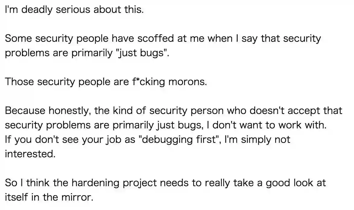 Linus Torvalds 也就之前的过激言论表示了歉意。Torvalds 对以安全为重点的贡献者的建议是报告错误而不是杀死进程。