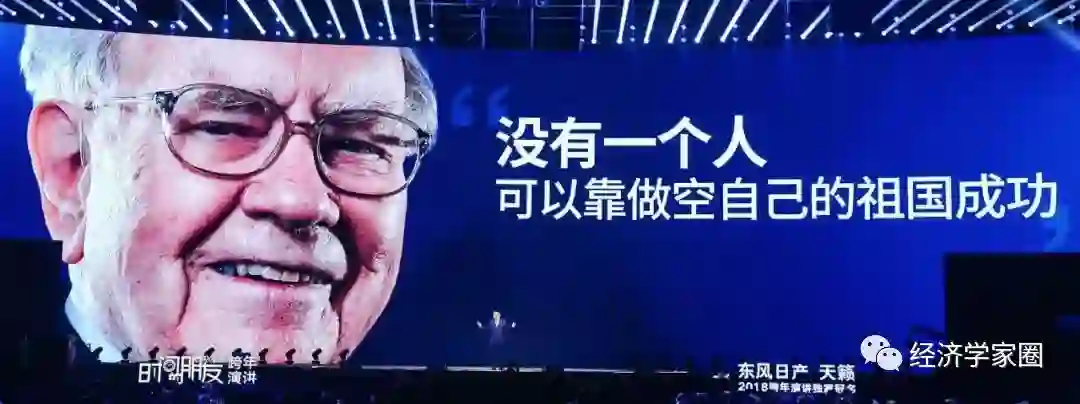 然后我又往后看了一眼,罗振宇在一个特别大的PPT背景下说,巴菲特还有一个提醒:”没有一个人可以靠做空自己的祖国成功。”