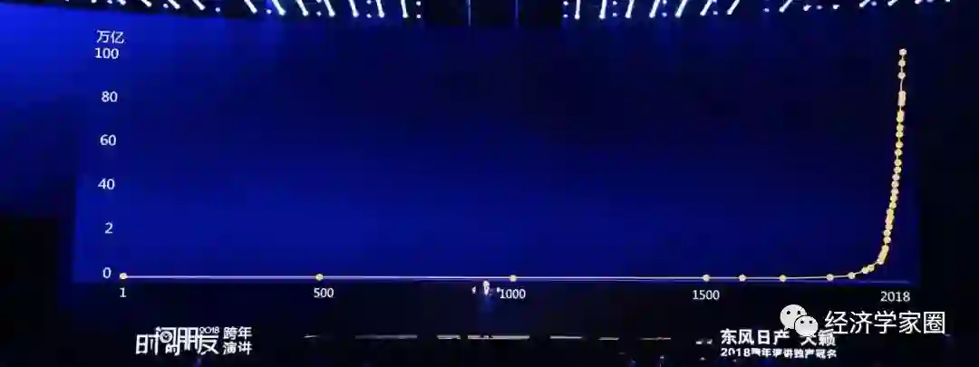 “金融学家香帅给我看了一张图,这是过去两千年人类社会GDP发展的曲线,你看有没有过倒栽葱?你说两千年跨度太大,不说明问题,来,咱们再看过去一百年: