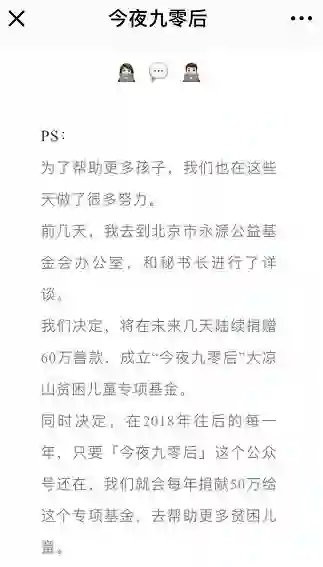 “我们想做更多的是公益,这些都是要花更大的时间和精力的。想切实地做点有意义的事情,对社会有帮助的事情。也希望大家能更关注这块,和我们一起去关心一下大凉山的贫困儿童,包括他们的读书环境、教学楼、三餐等等。我们也联系了很多家企业,之后会进行更大规模物资的捐赠,以及更成熟的公益团队的搭建。”今夜九零后成员说。