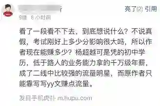 所以难免会有人暗搓搓地说:“如果是真的,那我觉得是一个有能力让自己过得更好的人,凭着小聪明和小运气得过且过”“杨超越可是凭的初中学历,低于路人的业务能力拿的千万年薪”……