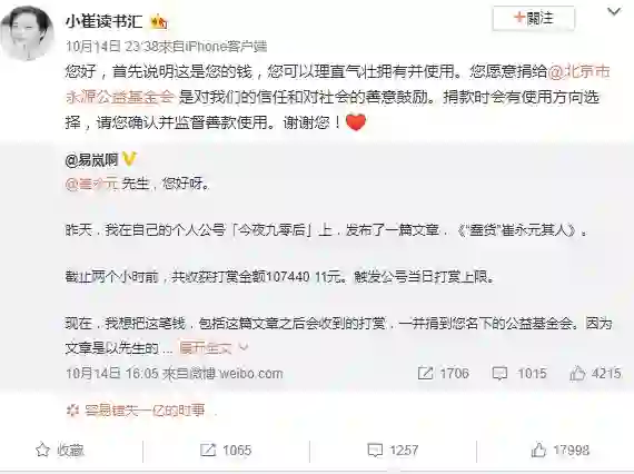 其中一篇《蠢货崔永元其人》在被删除之前阅读量达到 4700w,点赞破百万,评论条数破10w,评论点赞破10w,3次触发公众号打赏上限。