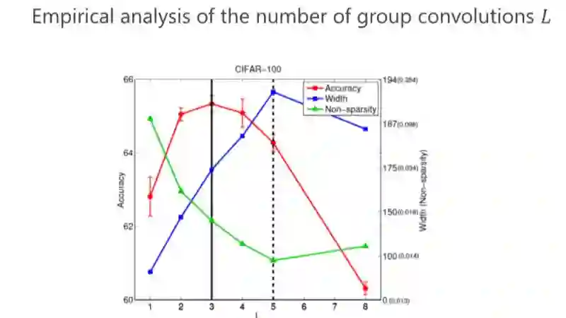 第二个问题,我们究竟要设计多少个组卷积(L 设成多少)?同样我们的准则也是通过参数量最小来进行分析,以前是两个组卷积,我们可以通过 3 个、4 个达到参数量更小,但其实最终的结论发现,并不是参数量最优的情况下性能是最好的。