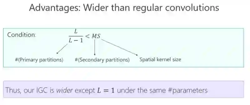 严格的准则引进来以后,参数量变小了、模型变小了,带来什么好处?这里我给一个结论,L 是(第)一个组卷积里面的 partitions(分支)的数目或者卷积的数目,M是第二组组卷积卷积的数目,S 是卷积核的大小,通常都是大于 1 的。这样的不等式几乎是恒成立的,这个不等式意味着什么?结论是:如果跟普通标准的卷积去比,通过我们的设计方式可以让网络变宽。跟网络变深相比起来,网络变宽是另外一个维度,变宽有什么好处?会不会让结果变好?我们做了一些实验。