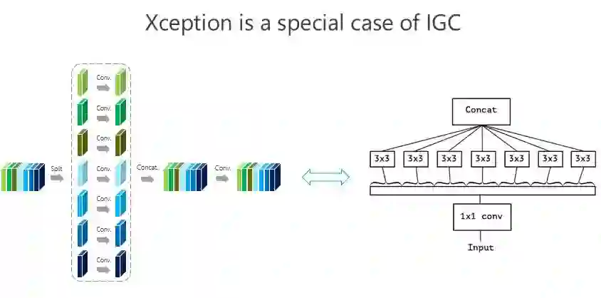 我们大概是前年 8、9 月份开始做这个事情,10 月份发现 Google 有一个工作是 Xception,这个是它的结构图,这个形式非常接近(我们的结构),跟我们前面所谓的 IGC 结构非常像,实际上就是我们的一个特例。当时我们觉得这个特例有没有可能结果最好,所以我们做了些验证,整体上我们结构好一点。