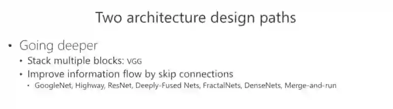 同一年,微软的同事发明了一个网络,叫“ResNet”,这个网络跟 Highway 在某种意义上很相像,相像在什么地方?它同样用了 Skip Connection,从某一层的 output 直接跳到后面层的 output 去。这个跟 Highway 相比,它把 gate function 扔掉了,原因在于在训练非常深的网络里 gate 不是一个特别好的东西。通过这个设计,它可以把 100 多层的网络训练得非常好。后来发现,通过这招 1000 层的网络也可以训练得非常好,非常了不起。