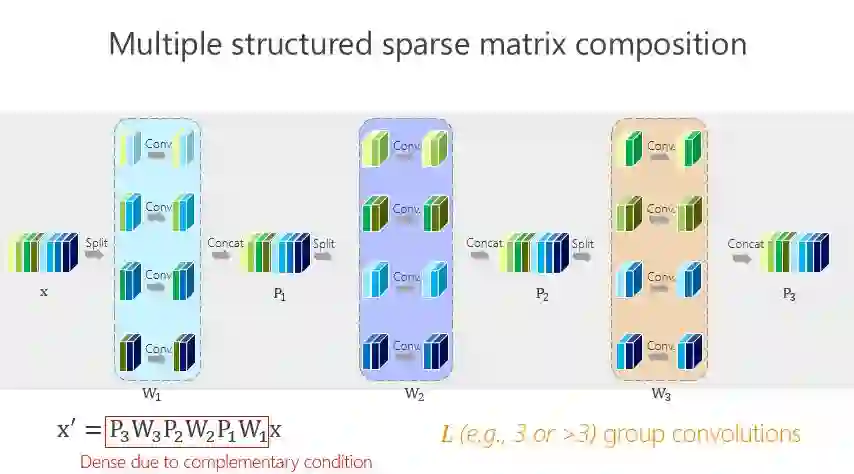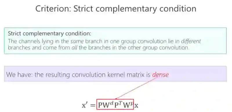 这里面我们引进了一个严格的互补条件,直观来讲就是,如果有两个通道在第一组卷积里面,落在同一个 Branch(分支),我希望在第二组里面落在不同的 Branch(分支)。第二组里面比如一个 Branch(分支)里面的若干个通道,要来自于第一个组卷积里面的所有 Branches(分支),这个称为互补条件。这个互补条件带来什么?它会带来(任何一对输入输出通道之间存在) path,也就是说相乘矩阵是密集矩阵。为什么称之为“严格的”?就是任何一个 input 和 output 之间有一条 path,而且有且只有一条path。