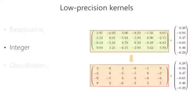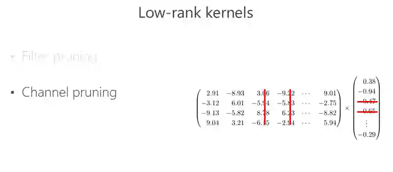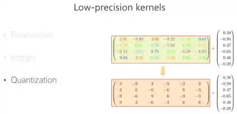还有一类研究得比较多的是量化。比如把这个矩阵聚类,比如 2.91、3.06、3.21,聚成一类,我用 3 来代替它量化有什么好处?首先,你的存储量减少了,不需要存储原来的数值,只需要存量化以后的每个中心的索引值就可以了。除此之外,计算量也变小了,你可以想办法让它减少乘的次数,这样就模型大小就会减少了。