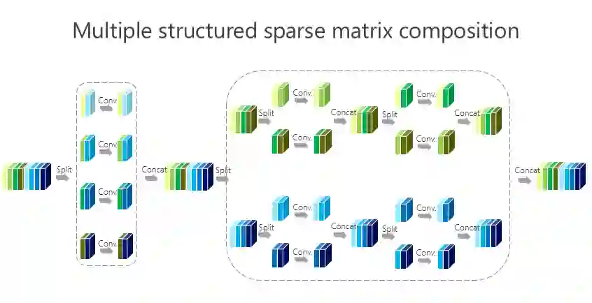 这个讲起来比较直接或简单一点,前面的网络结构是两个组卷积或者两个矩阵相乘得到的,我们有没有办法变得多一点?实际上很简单,如上图所示。