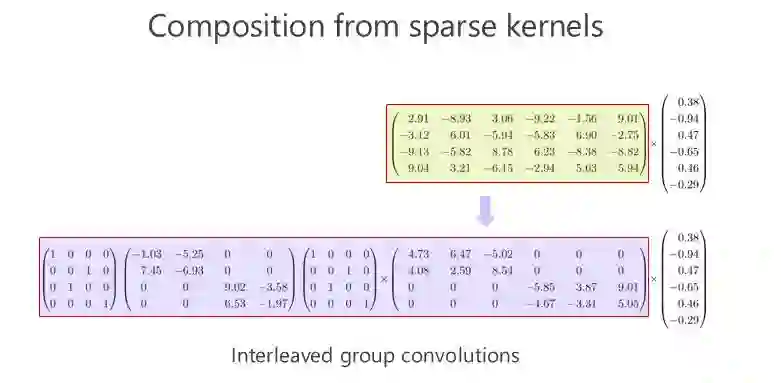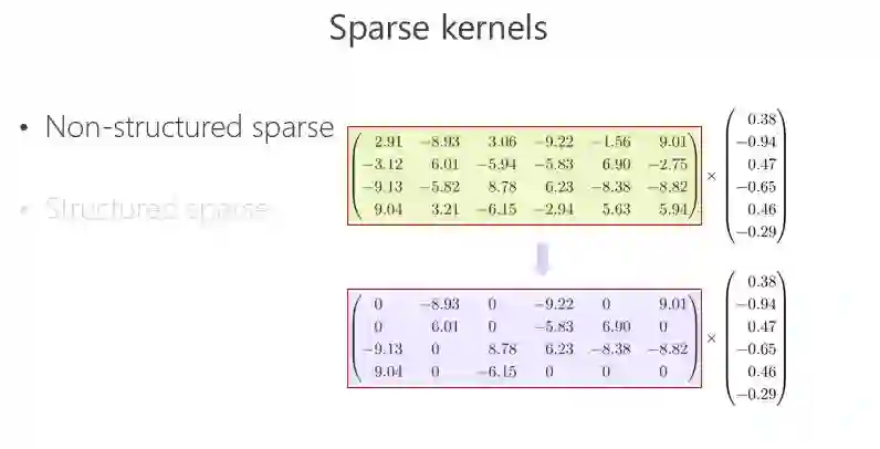 另外一条路,怎么把矩阵跟向量相乘变得快一点、模型的参数少一点?可以把里面的有些数变成 0,比如 2.91 变成 0,3.06 变成 0,变成 0 以后就成了稀疏的矩阵,这个稀疏矩阵存储量会变小,如果你足够稀疏的话,计算量会小,因为直接是 0 就不用乘了。还有一种 Structured sparse(结构化稀疏),比如这种对角形式,矩阵跟向量相乘,可以优化得很好。这里 Structured sparse 对应我后面将要讲的组卷积(Group convolution)。