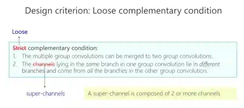 后来我们发现,如果遵循严格互补条件,模型的结构变得非常稀疏、非常宽,结果不见得是最好的。所以我们变成了 Loose。Loose 是什么意思?以前 output(输出通道)和 input (输入通道)之间是有且只有一个 path,我们改得非常简单,能不能多个path?多个 path 就没那么稀疏了,它好处在于每个 output (输出通道)可以多条路径从 input (输入通道)那里拿到信息,所以我们设计了 Loose condition。
