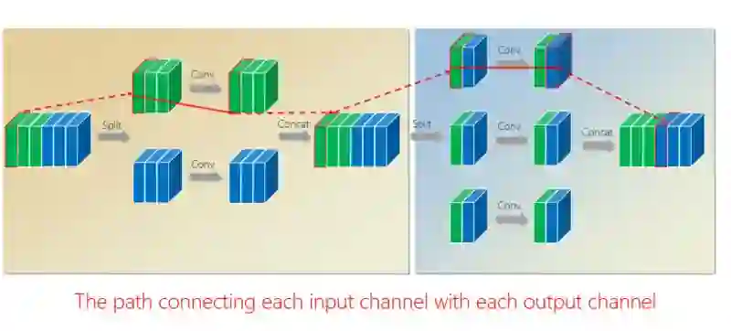 有什么好处?通过第二组的组卷积可以达到互补的条件,或者使得任何一个 output(输出通道)和任何一个 input(输入通道)连起来。