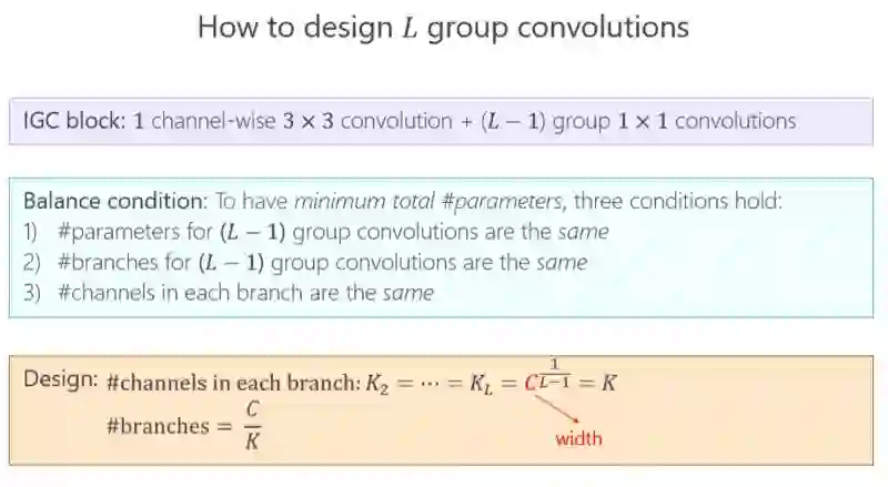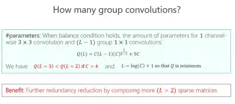 这种方法带来的好处很直接,就是希望参数量尽量小,那怎么才能(使)参数量尽量小?我们引进了所谓的平衡条件。虽然这里面我们有 L-1 个 1×1 的组卷积,但 L-1 个 1×1 的组卷积之间有区别吗?谁重要一点、谁不重要一点?其实我们也不知道。不知道怎么办?就让它一样。一样了以后,我们通过简单的数学推导就会得出上面的数学结果。