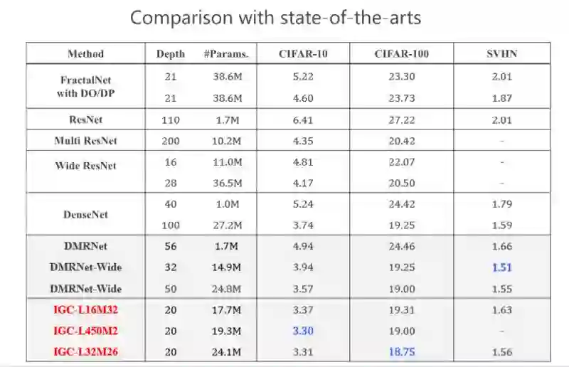 后来 CIFRA-100 我们也做了同样的实验,发现我们提升仍然是一致的,甚至跟前面的比起来提高得更大,因为分 100 类比分 10 类困难一点,说明越困难的任务,我们的优势越明显。这个变宽了以后(性能)的确变好了,通过 IGC 实现,网络结构变宽的确会带来好处。