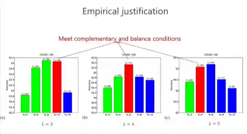 现在再验证一下,前面讲了互补条件、平衡条件,那这个结果是不是最好的?或者是不是有足够的优势?我们做了些实验,这个红色的是对应满足我们条件的,发现这个情况下(L=4)结果是最好的。其实是不是总是最好?不见得,因为实际问题跟理论分析还是有点距离。但我们总体发现基本上红色的不是最好也排在第二,说明这种设计至少给了我们很好的准则来帮助设计网络结构。这个虽然不总是最好的,但和最好的是差不多的。