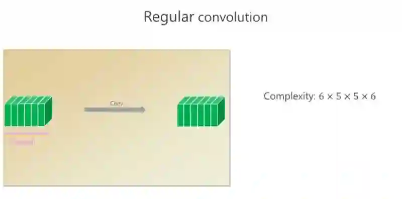 这个卷积里面有六个通道,通过卷积出来的也是六个小方块(通道),假如 spatial kernel 的尺寸是5×5,对每个位置来讲,它的计算量是6×5×5×6。