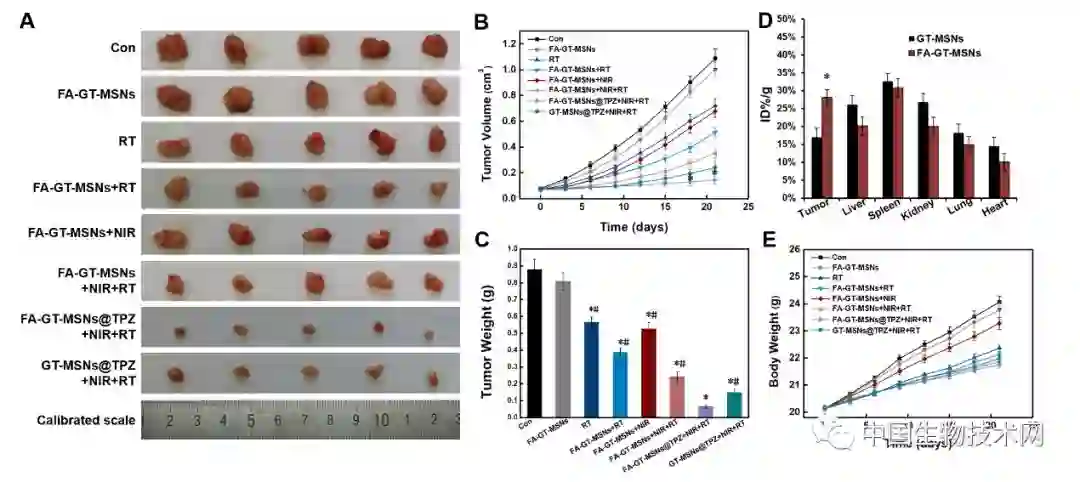 图2 为Janus 纳米平台的肿瘤治疗效果。 (A)肿瘤图像,(B)肿瘤生长曲线,(C)各组小鼠肿瘤重量,(D)ICP-OES定量分析用药后24小时组织和肿瘤组织中纳米粒子的累积情况,(E)各组小鼠体重。 这些结果表明该纳米平台具有极好的抗肿瘤效果。