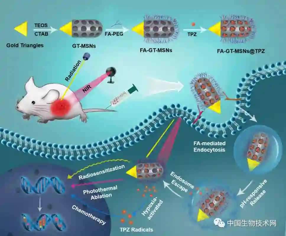 中国科学院苏州生物医学工程技术研究所董文飞课题组近期制备了一种多功能的Janus型金三角介孔二氧化硅纳米颗粒,并利用其担载乏氧特异性前药替拉扎明以同时实现肿瘤的外源性放射增敏、局部光热治疗和缺氧特异性化疗。 在细胞和动物实验中,这种Janus型纳米平台表现出了极好的放射增敏效果和光热治疗效果。 而负载替拉扎明药物的Janus纳米平台具有pH响应性的药物释放行为。 并且该纳米平台能够有效地提高替拉扎明在肿瘤细胞的内化作用。 更重要的是,替拉扎明介导的低氧特异性化疗有效地补充了放疗与光热治疗在低氧肿瘤组织中的治疗效果,因而明显地抑制了肿瘤的生长。 此外,该纳米平台表现出了极好的安全性。