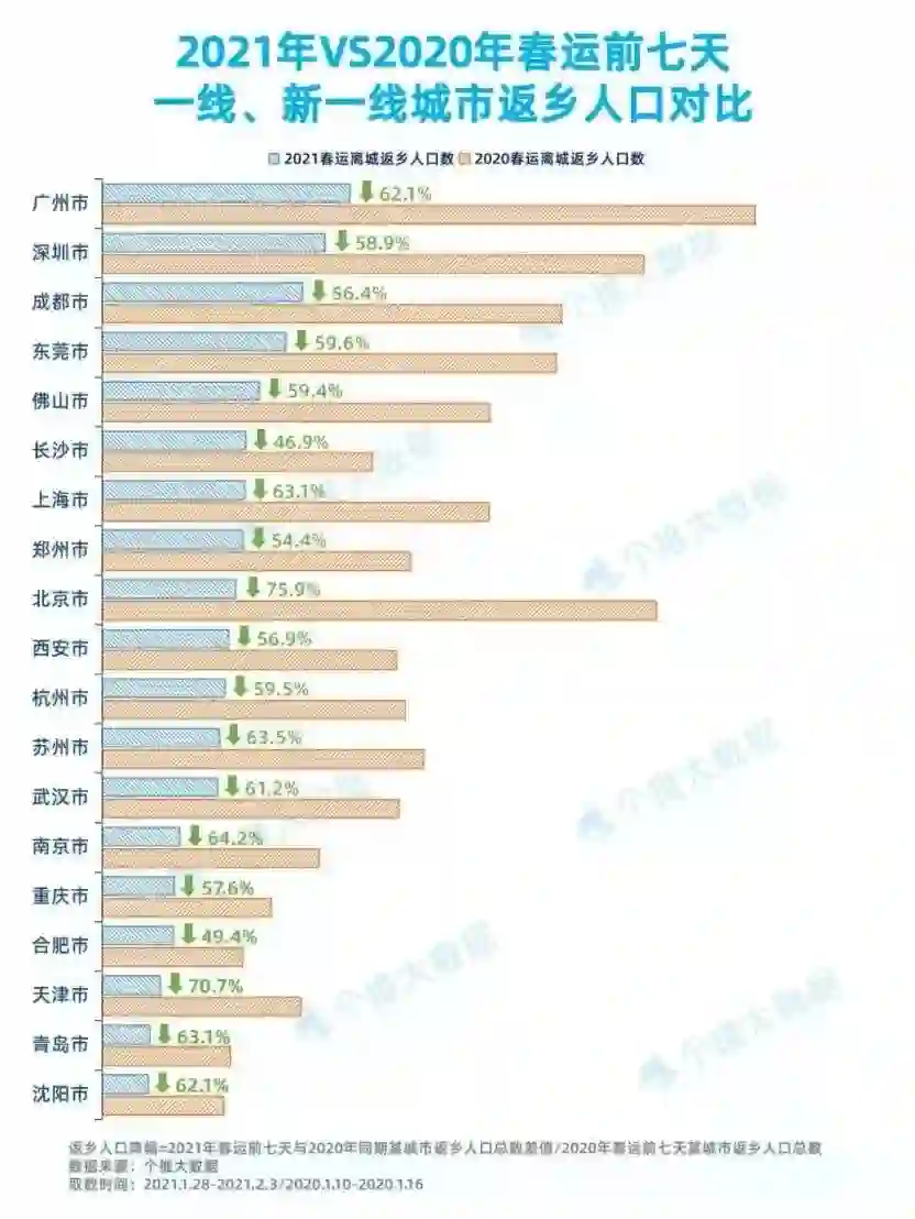 对比往年春运数据会发现,大家对就地过年都表示了理解和支持,2019年全国春运旅客的发送量达到29.9亿人次,但2020年疫情后仅有不到15亿人次。像北京这样的城市,返乡人口直接比去年同期下降了75.9%。