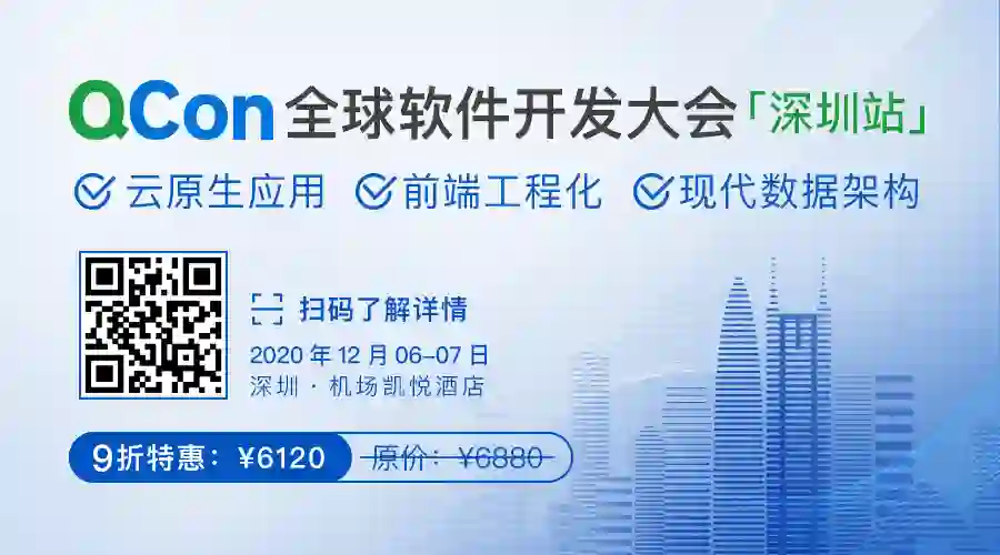 目前 QCon 全球软件开发大会(深圳站)9 折门票抢购中,限时立减 680 元!优惠活动截至 2020 年 11 月 20 日,同时 QCon 大会启动上海站(2020 年 12 月 20-21 日)和北京站(2021 年 1 月 8-9 日),扫描下图二维码或点击【阅读原文】进入大会官网查看你感兴趣的技术话题吧!