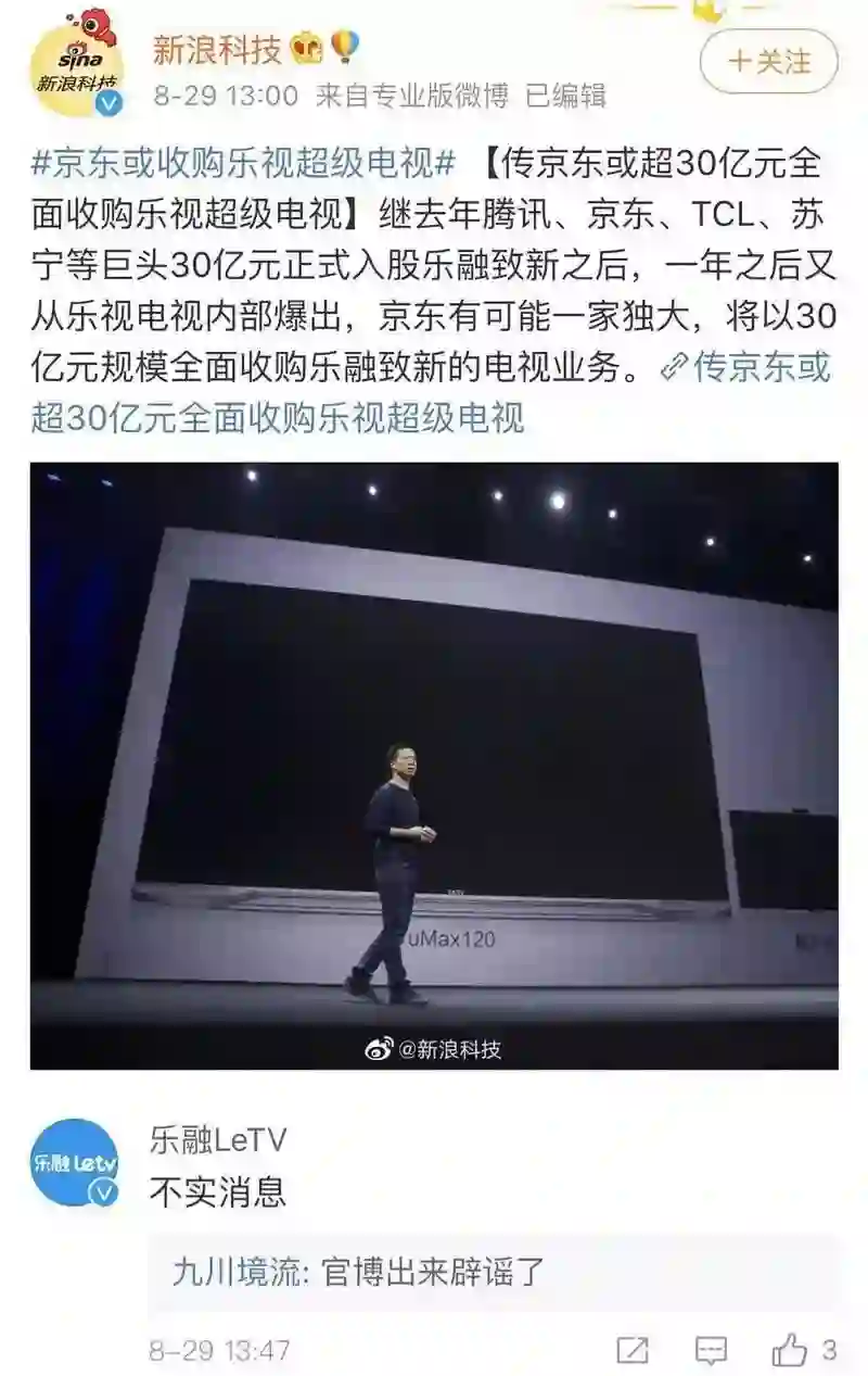 36氪获悉,针对有消息称京东将以30亿元规模全面收购乐视超级电视(乐融致新的电视业务),乐融LeTV通过官方微博回应称:不实消息。
