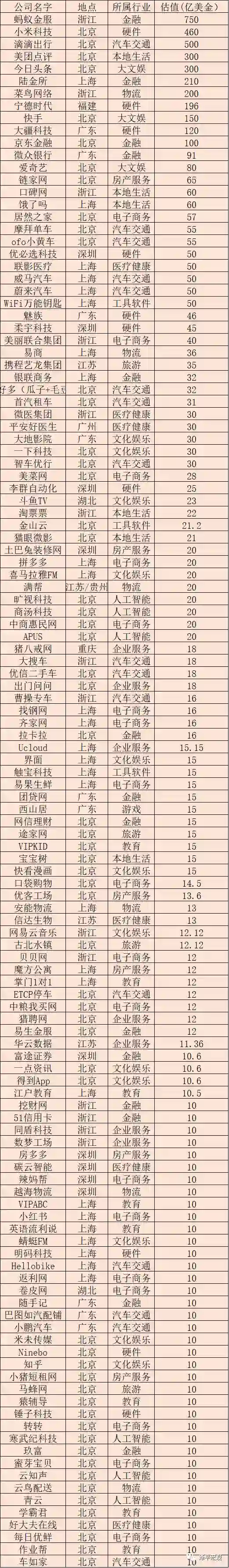 在当前企业生态化的趋势下,独角兽企业已经成为企业生态链的重要构成。通过自孵化以及战略投资的方式,平台型企业能够建构一个完整的生态系统。从榜单中可以看出,大约50%的企业或多或少的于BAT有关联。其中,与阿里巴巴有关联的有27家、与腾讯有关联的有37家、与百度有关联的有16家;其中于三者都有关联的有三家,分别为饿了吗、滴滴出行和汽车帮。