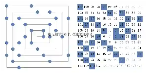 作为螺旋中央的起始数,我们将发现对角线上的数字恰符合欧拉发现的公式