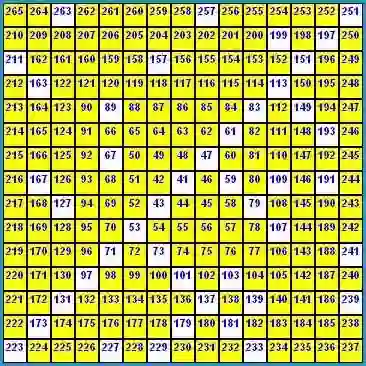 位于螺旋的中央,其它整数绕螺旋的逆时针方向排列。方格图中的复合数格子标为黄色,质数格子标为白色。