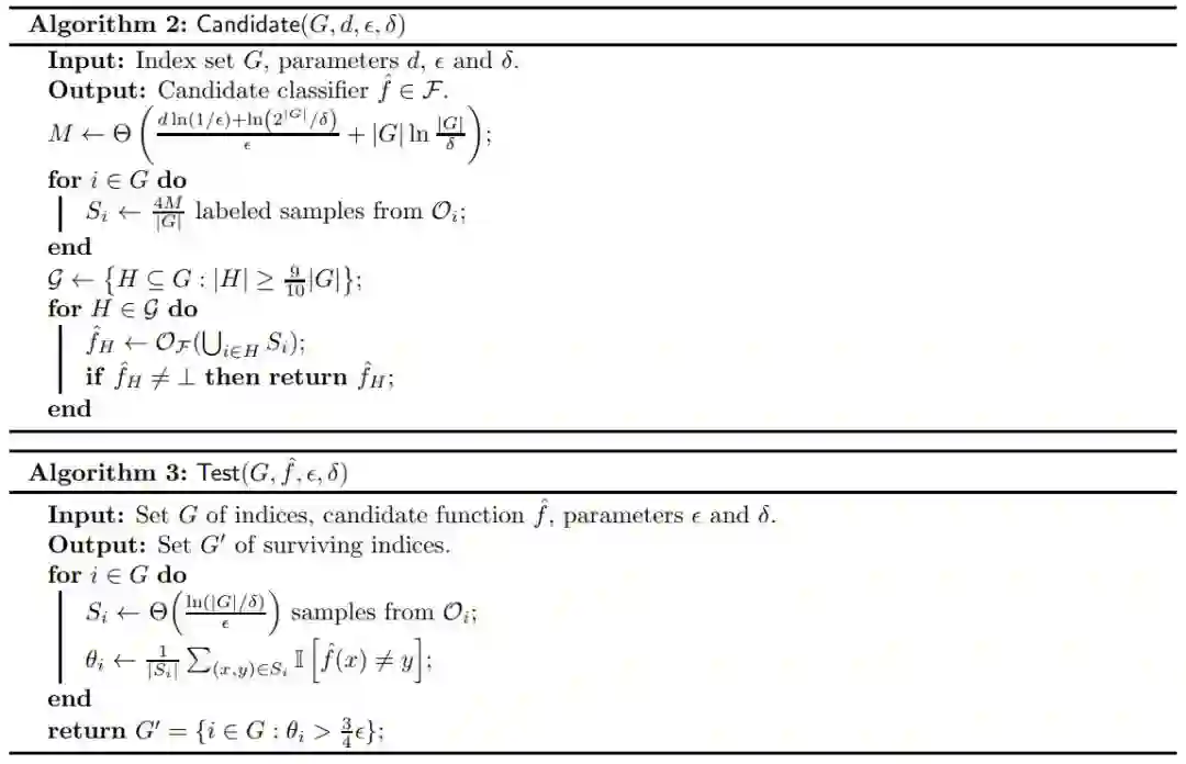 在这部分里,研究者展示了一种迭代(ǫ, δ, η)-学习算法,达到了 O(ηn+ln n)的计算开销(n=O(d))。这里 n表示用户数量,d 表示假设类 F 的 VC-维。由于 F 可以是很大甚至为无穷大的值,作者假设算法通过一个 oracle O_F 访问 F,给定一个标记样本的集合 S={(x_i,y_i)},算法将返回一个分类器 f∈F 从而 f(x_i)=y_i 对所有数据对(x_i , y_i)∈ S 都成立;或者返回⊥,如果 F 不包含任何一致函数。算法通过 n 个样本的数据库 O_1,O_2,...,O_n 和潜在的数据分布 D_1,D_2,...,D_n 进行交互,其中最多有η比例的样本是恶意的。