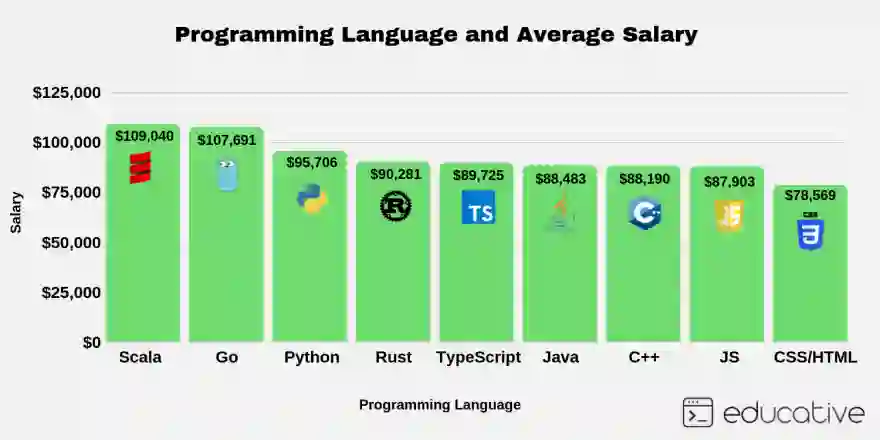 为什么Scala和Go的平均工资这么高?随着Scala的不断改进,很多公司开始注意并迅速采用,根据需要构建可伸缩的程序。Scala通常也用于企业设置,这也是平均起薪如此之高的原因。