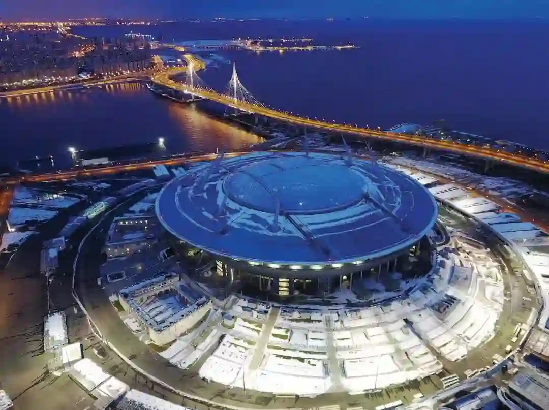 圣彼得堡体育场的设计理念,是让整座球场看上去就像一艘降落到芬兰湾岸边的太空飞船——公平地讲,这座球场的外观确实符合这种描述。据称圣彼得堡体育场是全世界成本最高的场馆,达到 15 亿美元,可容纳观众 68,134 人。