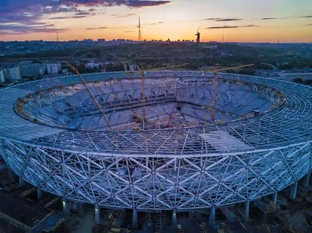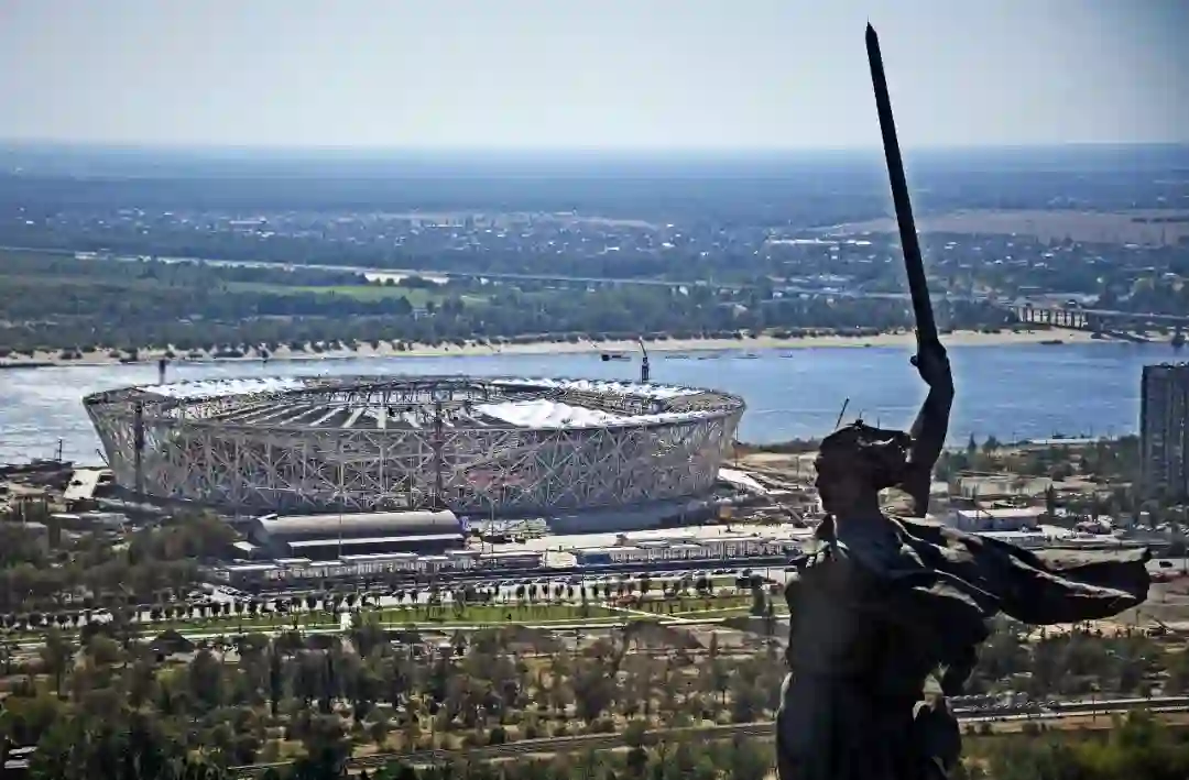 伏尔加格勒竞技场建于马马耶夫岗战争纪念馆旁,后者也是伏尔加格勒市最重要的地标建筑。山岗上耸立着一尊象征“祖国母亲”的高大塑像,她手擎一把长达 11 米的利剑,而整个建筑是为了纪念苏联在 1943 年取得斯大林格勒保卫战的胜利。 世界杯后这里将成为俄甲球队伏尔加格勒转子的主场。拥有 45,568 个坐席的伏尔加格勒竞技场于 2015 年初动工,总造价将近 170 亿卢布。