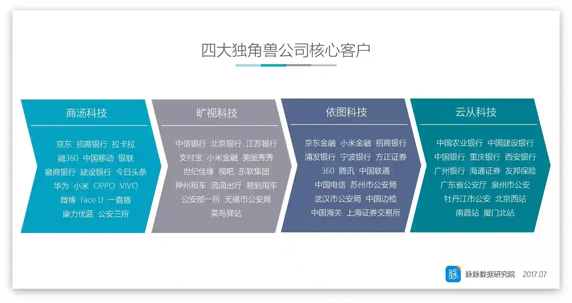云从科技是我国银行业人脸识别应用最普及的供应商,包括农行、建行、中行、交行等全国 50 多家银行已采用云从的产品,市面上许多银行的金融身份认证与远程认证平台是使用的云从技术,这种情况不仅仅因为技术实力强,更因为云从是受邀起草与制定人脸识别国家标准的人脸识别企业,有着过硬的技术指标与研发背景。