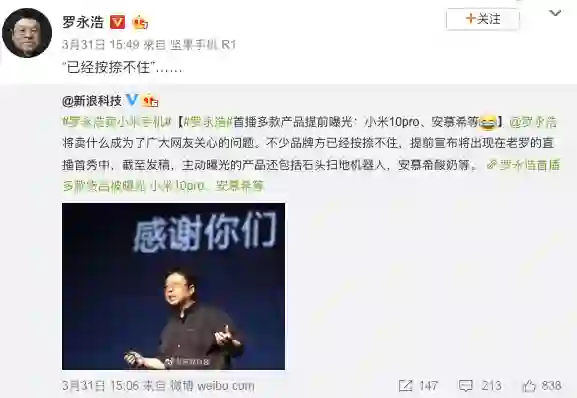 【罗永浩首播多款货品被曝光,小米10pro、安慕希等】3月31日,小米手机发布海报,称小米10成为罗永浩抖音带货的第一款手机。而据知情人士介绍,罗永浩当晚销售的手机不仅有小米10,还包括小米10 Pro。目前主动曝光将出现在罗永浩抖音首秀的产品,还包括石头扫地机器人,安慕希酸奶等。此外,罗永浩发布的预热视频显示,4月1日晚,他还将在直播中发放数十万红包,不过是以现金红包还是代金券的形式,目前尚未公布。