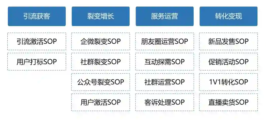 基于私域流量运营体系的关键模块:私域引流、增长裂变、服务运营、转化变现,梳理个模块的主要私域工作,大规模用户/高运营人力/标准化流程的工作都进行SOP的设计应用,形成私域SOP体系。