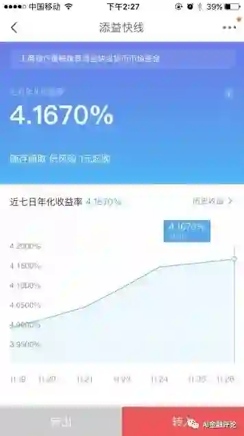 根据天天基金数据,截至2017年9月30日,添益快线货币基金规模达到1036.54亿元,是目前工银瑞信规模第二大的基金产品。其中规模最大的基金为工银货币,但对大众用户来说,添益快线存取灵活性相对更优。