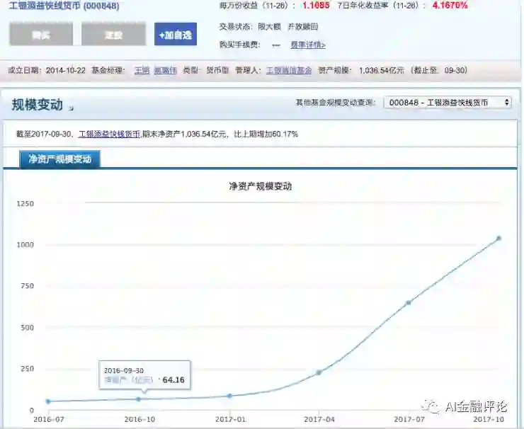 图片数据来源于天天基金。可以看出,添益快线规模一年的时间里,从2016年9月30日的64.16亿元,扩大至1036.54亿元。