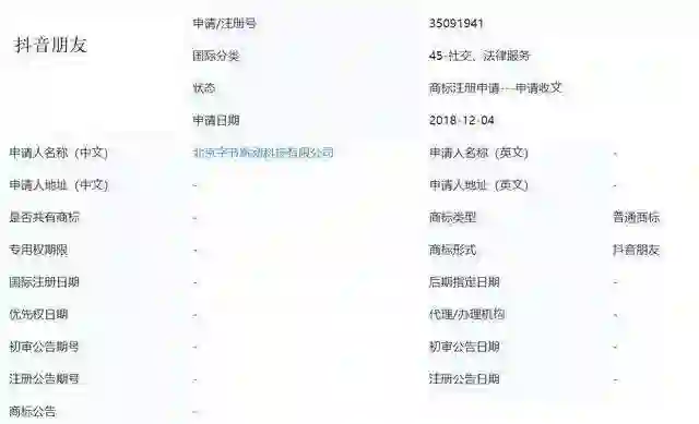 昨日消息,「今日头条」母公司字节跳动于 12 月 4 日提交了一份名为「抖音朋友」的商标申请。该商标类型为社交、法律服务类,目前处于「申请收文」状态。